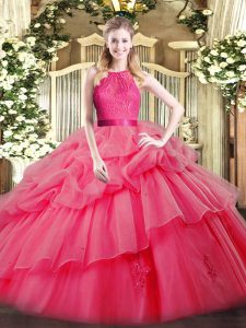 Home >  Quinceanera Dresses >  Custom Made Quinceanera Dresses > Dazzling Coral Red Sleeveless Floor Length Lace and Ruffled Layers Zipper 15 Quinceanera Dress