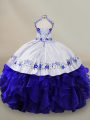Dazzling Floor Length Blue And White Sweet 16 Dress Halter Top Sleeveless Lace Up