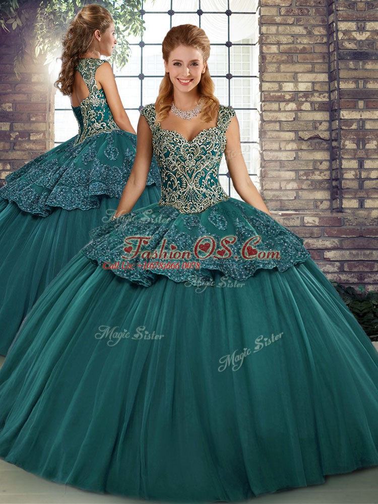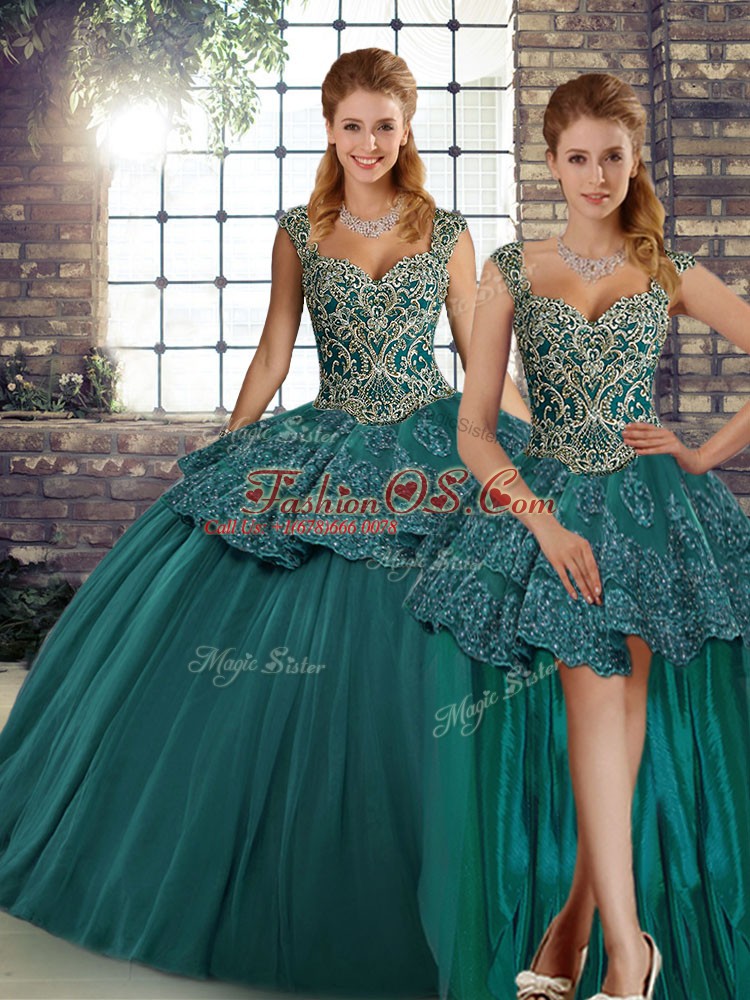 Home >  Quinceanera Dresses >  Detachable Quinceanera Skirts > Dazzling Green Straps Neckline Beading and Appliques Sweet 16 Dress Sleeveless Lace Up