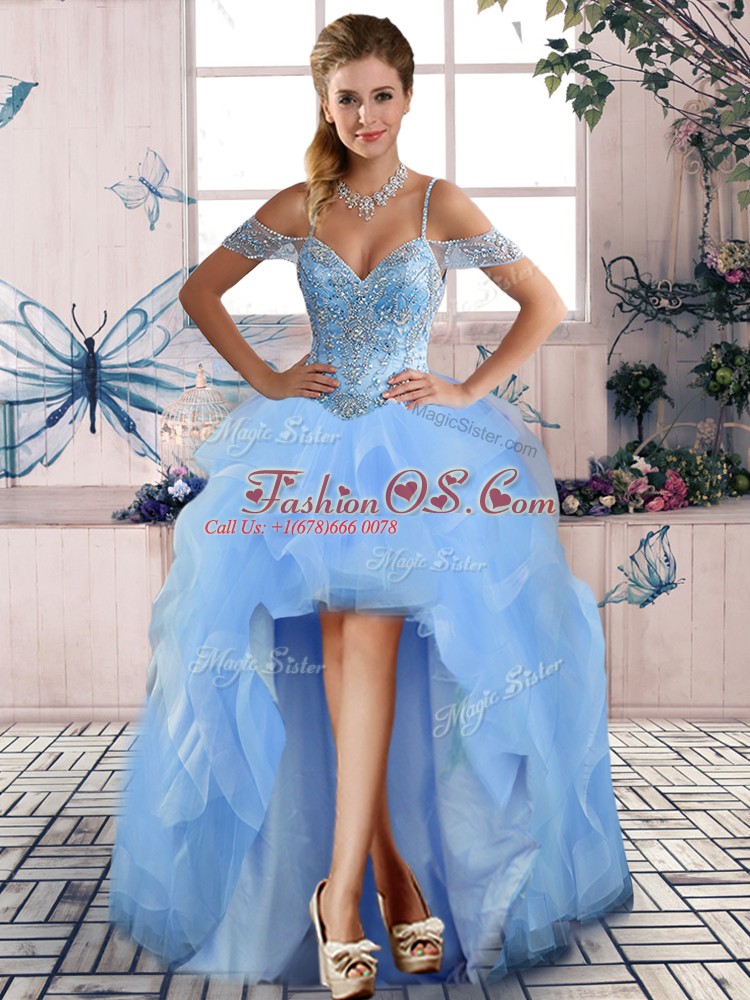 Dazzling Light Blue A-line Beading and Ruffles Prom Dresses Lace Up Tulle Sleeveless High Low