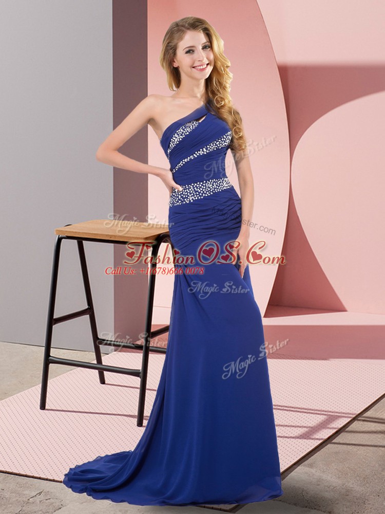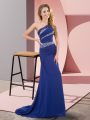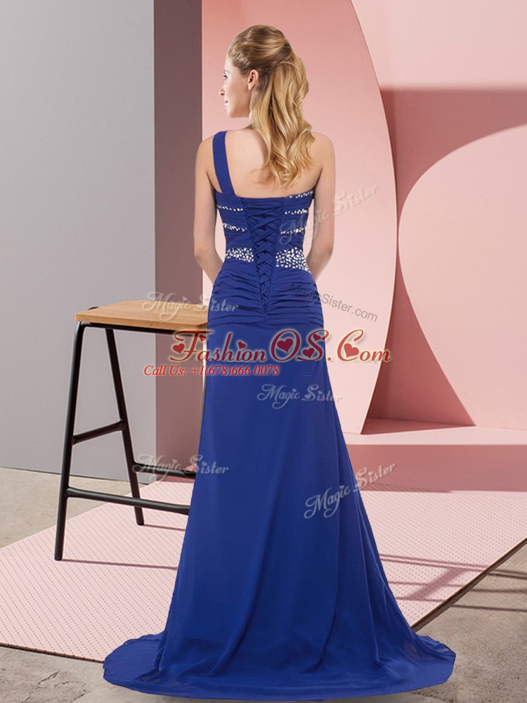 Dazzling One Shoulder Sleeveless Sweep Train Lace Up Dress for Prom Blue Chiffon