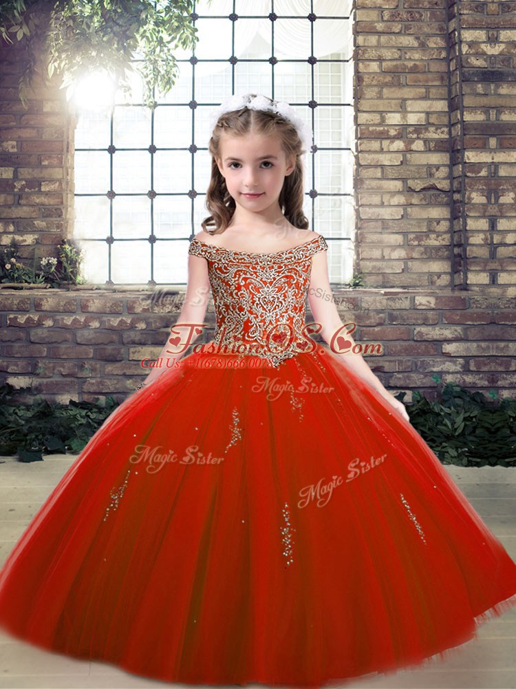 Home >  Special Occasion Dresses >  2019 Little Girl Pageant Dresses > Dazzling Red Off The Shoulder Lace Up Beading and Appliques Kids Pageant Dress Sleeveless