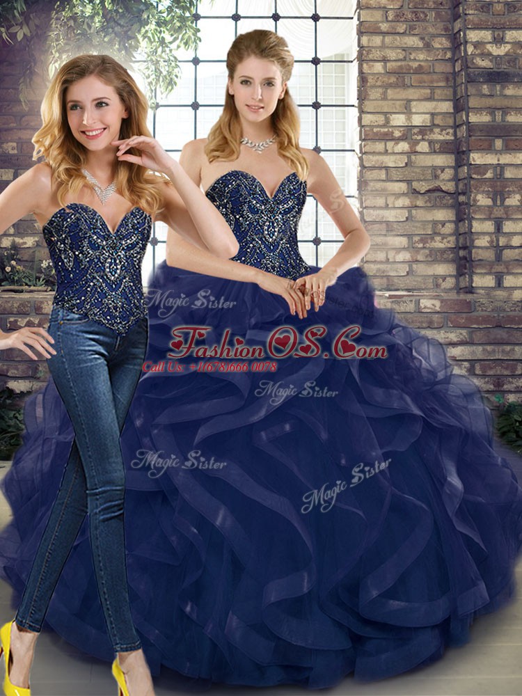 Home >  Quinceanera Dresses >  Detachable Quinceanera Skirts > Dazzling Sleeveless Floor Length Beading and Ruffles Lace Up 15th Birthday Dress with Navy Blue