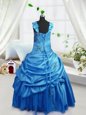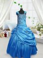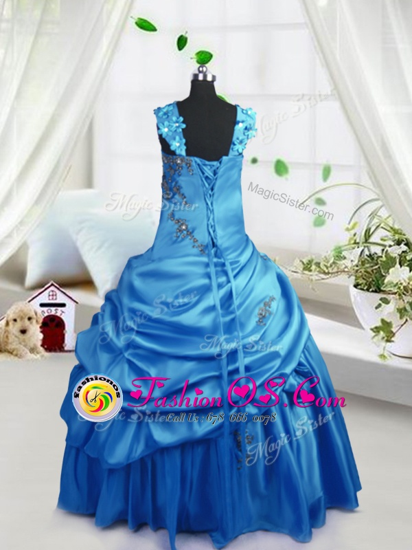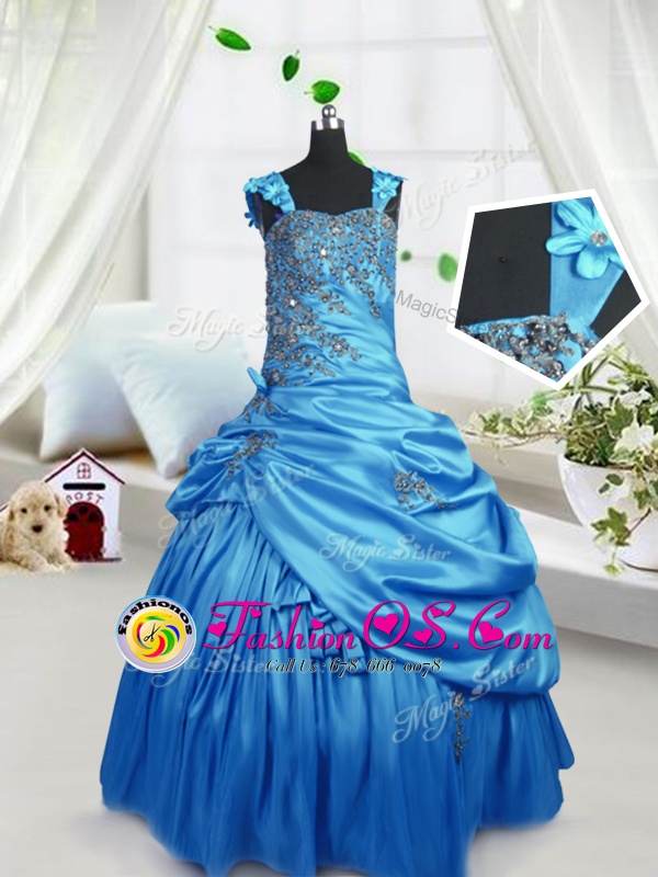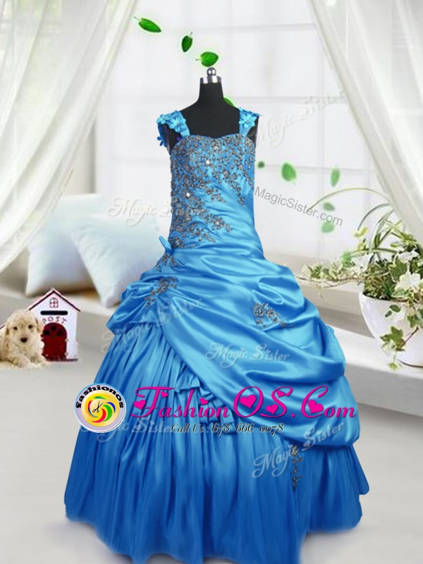 Home >  Special Occasion Dresses >  New Style Little Girl Pageant Dresses > Dazzling Straps Sleeveless Child Pageant Dress Floor Length Beading and Pick Ups Aqua Blue Satin