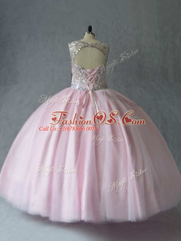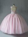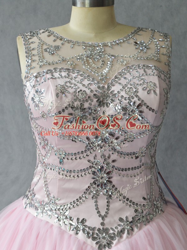 Dazzling Tulle Scoop Sleeveless Lace Up Beading 15 Quinceanera Dress in Baby Pink