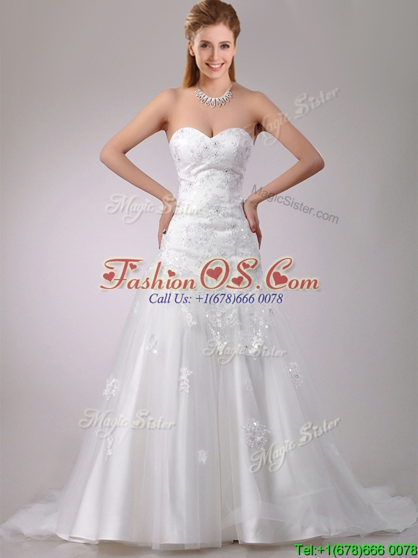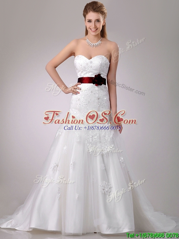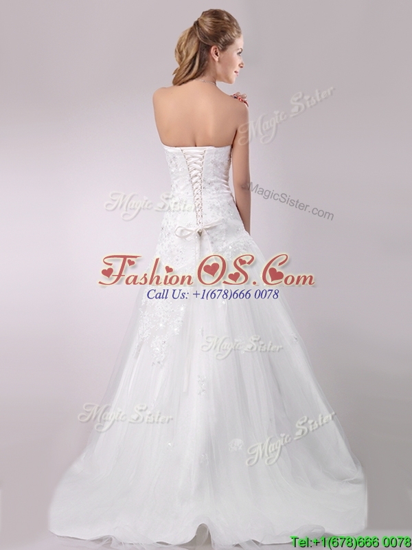Decent A Line Brush Train Beaded and Applique Wedding Dress with Sash