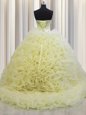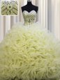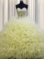 Home >  Quinceanera Dresses >  Sweet 16 Dresses > Decent Brush Train Fabric With Rolling Flowers Sweetheart Sleeveless Lace Up Beading and Pick Ups Quinceanera Dresses in Light Yellow