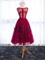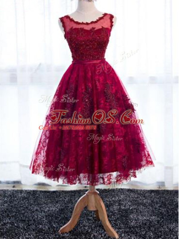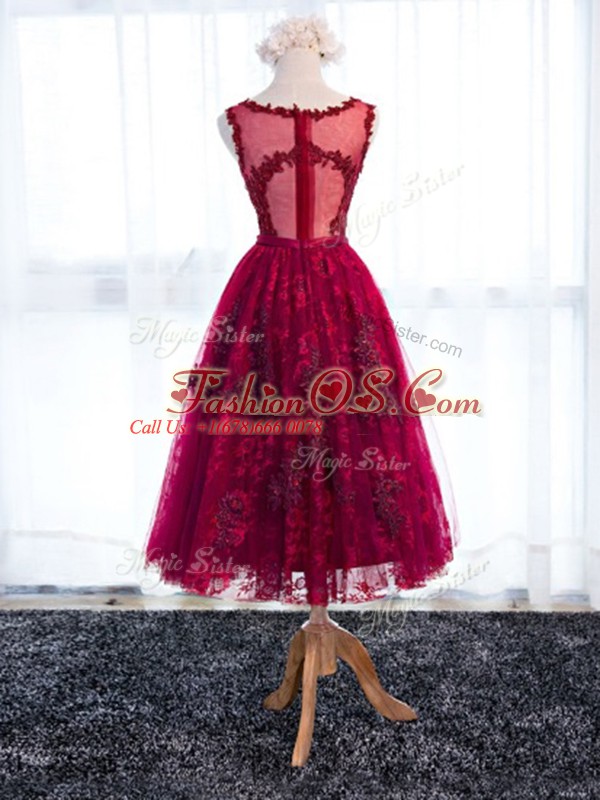 Decent Fuchsia Lace Zipper Scoop Sleeveless Tea Length Wedding Guest Dresses Lace
