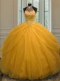 Home >  Quinceanera Dresses >  Popular Quinceanera Dresses > Decent Halter Top Sleeveless Lace Up Sweet 16 Quinceanera Dress Gold Tulle