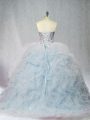 Decent Light Blue Tulle Lace Up 15th Birthday Dress Sleeveless Brush Train Beading and Ruffles