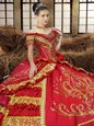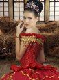 Decent Off the Shoulder Floor Length Lace Up Sweet 16 Dress Red and In for Military Ball and Sweet 16 and Quinceanera with Beading and Embroidery and Ruffled Layers