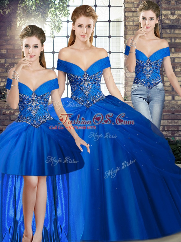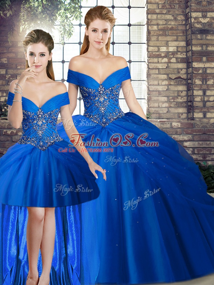Home >  Quinceanera Dresses >  Detachable Quinceanera Skirts > Decent Off The Shoulder Sleeveless 15 Quinceanera Dress Brush Train Beading and Pick Ups Royal Blue Tulle
