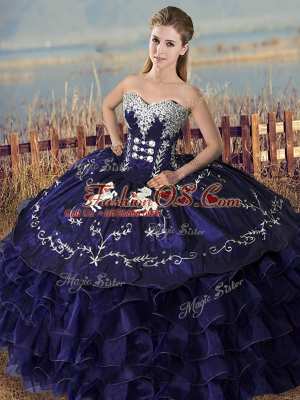 Decent Purple Ball Gowns Embroidery and Ruffles Quince Ball Gowns Lace Up Organza Sleeveless Floor Length