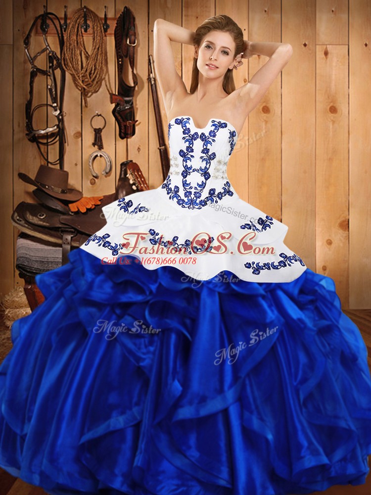 Home >  Quinceanera Dresses >  Detachable Quinceanera Skirts > Decent Royal Blue Ball Gowns Satin and Organza Strapless Sleeveless Embroidery and Ruffles Floor Length Lace Up 15 Quinceanera Dress