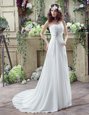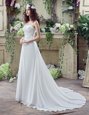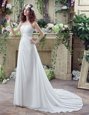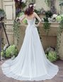 Decent Sleeveless Beading and Appliques and Ruching Lace Up Wedding Gown with White Brush Train