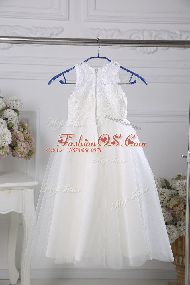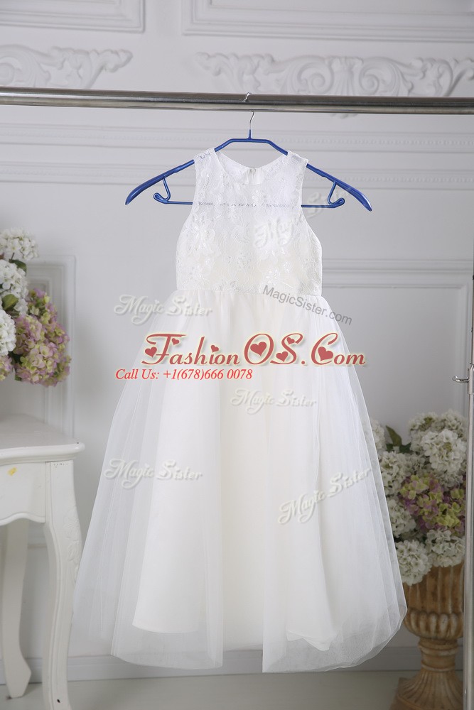 Delicate Floor Length White Toddler Flower Girl Dress Tulle Sleeveless Lace