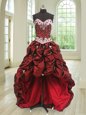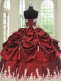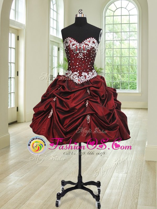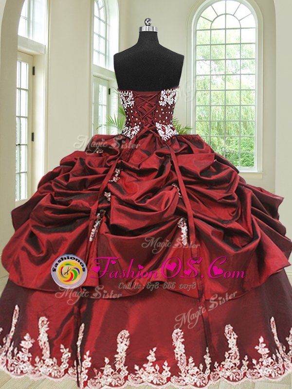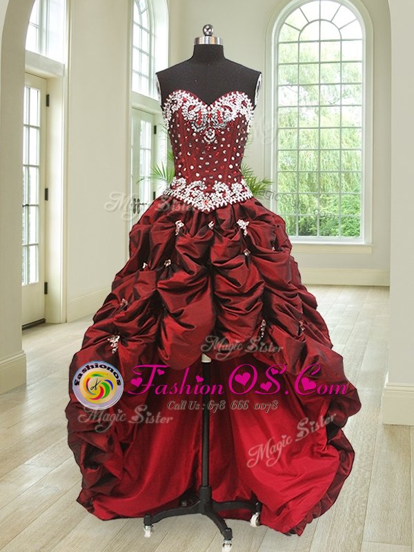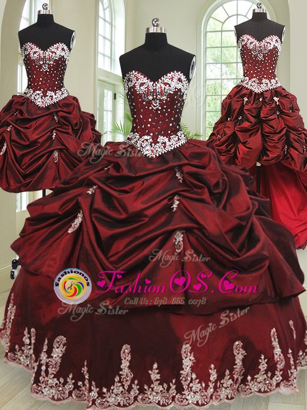 Delicate Four Piece Wine Red Ball Gowns Sweetheart Sleeveless Taffeta Floor Length Lace Up Beading and Appliques and Pick Ups Quinceanera Dress