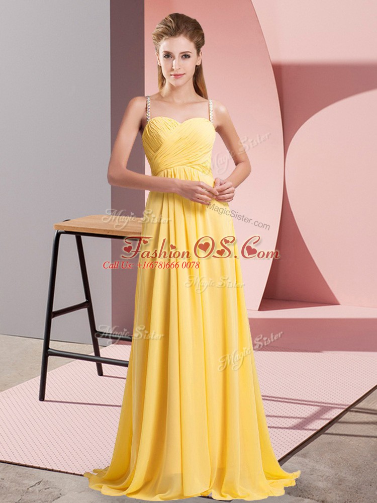 Home >  Prom Dresses >  Fashionable Prom Dresses > Delicate Gold Empire Chiffon Spaghetti Straps Sleeveless Ruching Floor Length Lace Up Prom Gown