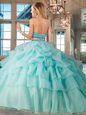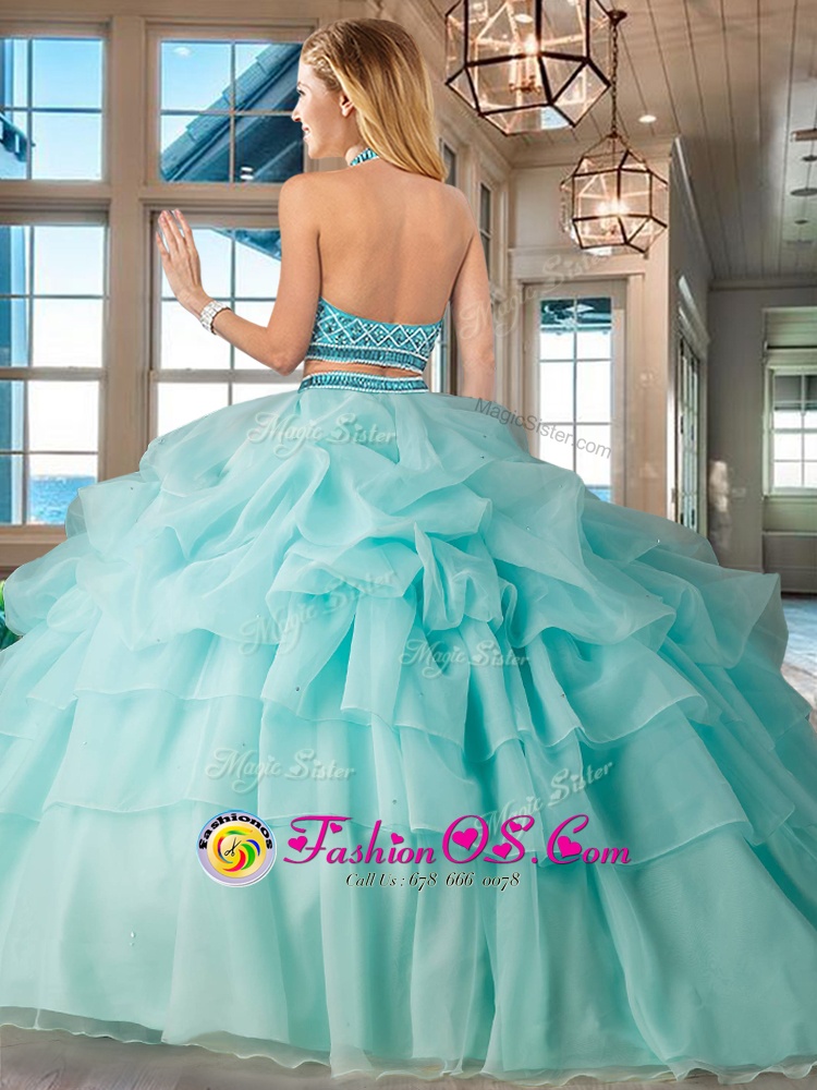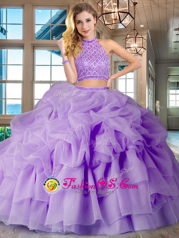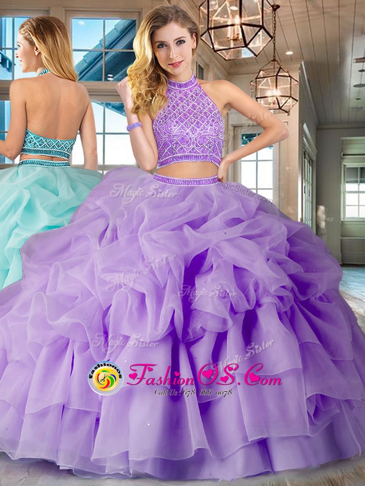 Delicate Lavender Two Pieces Halter Top Sleeveless Organza Brush Train Backless Beading and Ruffled Layers and Pick Ups Quinceanera Gown