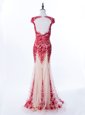 Home >  Special Occasion Dresses >  Mother of the Bride Dresses > Delicate Mermaid Scoop Backless Red Mother Of The Bride Dress Tulle Brush Train Cap Sleeves Appliques