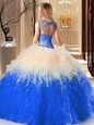 Delicate Multi-color Tulle Backless High-neck Sleeveless Floor Length Quinceanera Dress Beading and Ruffles
