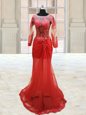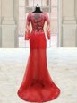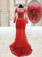 Delicate Red Scoop Neckline Appliques Prom Evening Gown Long Sleeves Side Zipper