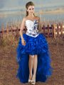 Delicate Sweetheart Sleeveless Quinceanera Gowns Floor Length Embroidery and Ruffles Blue And White Satin and Organza