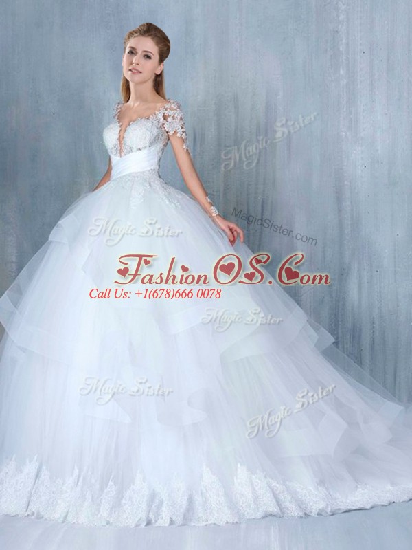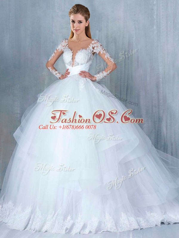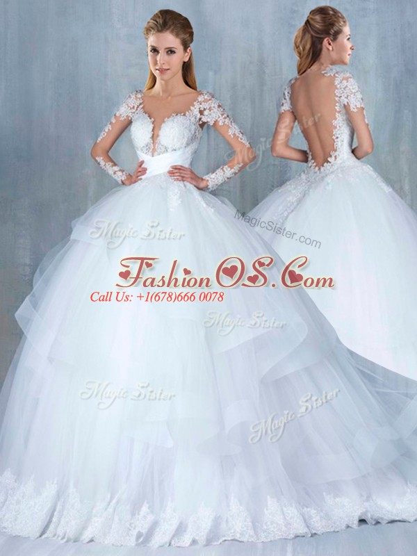 Home >  Wedding Dresses >  Fashionable Wedding Dresses > Delicate White Long Sleeves Lace and Appliques and Ruffles Backless Wedding Dresses