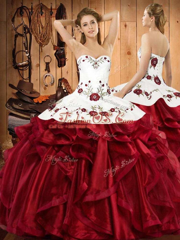 Home >  Quinceanera Dresses >  Best Quinceanera Dresses > Delicate Wine Red Ball Gowns Organza Halter Top Sleeveless Embroidery and Ruffles Floor Length Lace Up Quinceanera Dresses