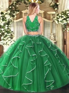 Deluxe Beading and Ruffles Quince Ball Gowns Olive Green Zipper Sleeveless Floor Length
