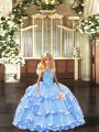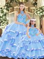 Deluxe Blue Sleeveless Embroidery and Ruffled Layers Lace Up Quinceanera Gowns