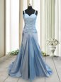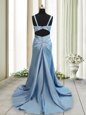 Deluxe Elastic Woven Satin Straps Sleeveless Sweep Train Criss Cross Beading Prom Party Dress in Light Blue