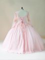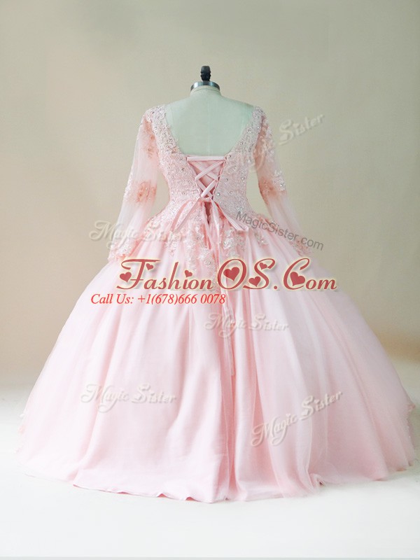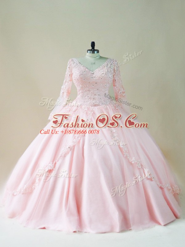 Home >  Quinceanera Dresses >  Fast Delivery Quinceanera Dresses > Deluxe Long Sleeves Satin and Tulle Floor Length Lace Up Quinceanera Dress in Baby Pink with Beading and Appliques
