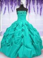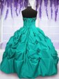 Home >  Quinceanera Dresses >  Pretty Quinceanera Dresses > Deluxe Mermaid Strapless Sleeveless 15th Birthday Dress Floor Length Embroidery and Pick Ups Aqua Blue Taffeta