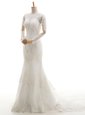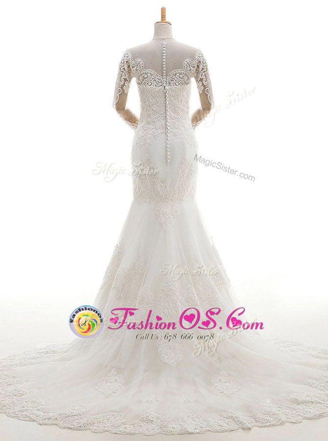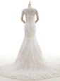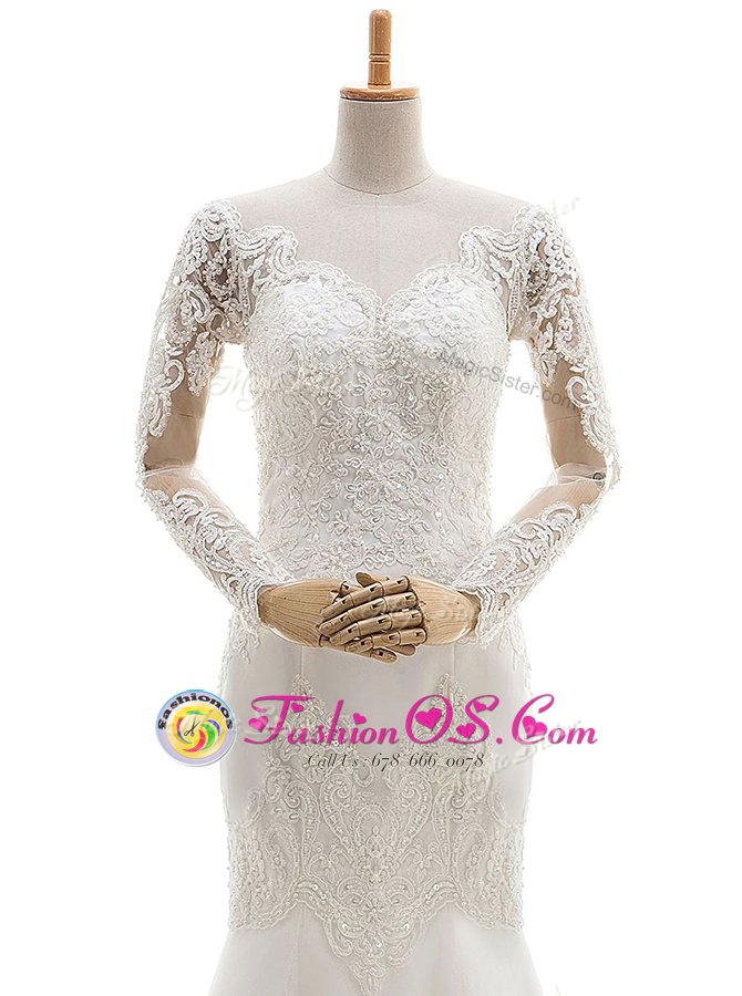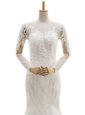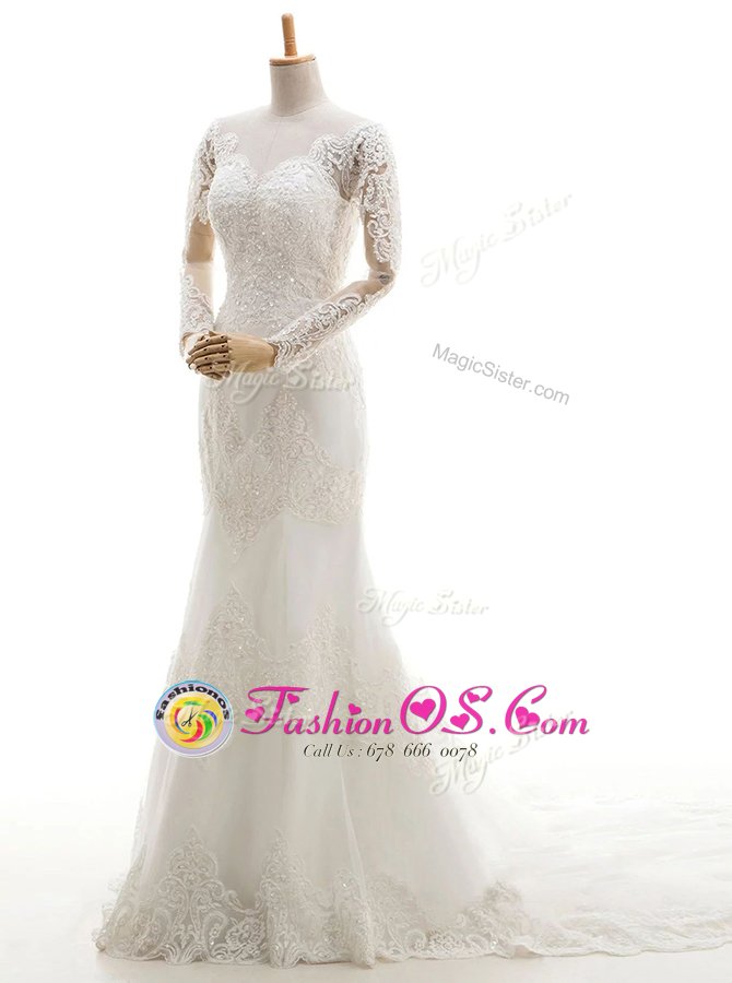 Deluxe Mermaid White V-neck Neckline Lace and Appliques Wedding Gown Long Sleeves Clasp Handle