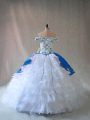 Deluxe Organza Off The Shoulder Sleeveless Lace Up Embroidery and Ruffles Vestidos de Quinceanera in Blue And White