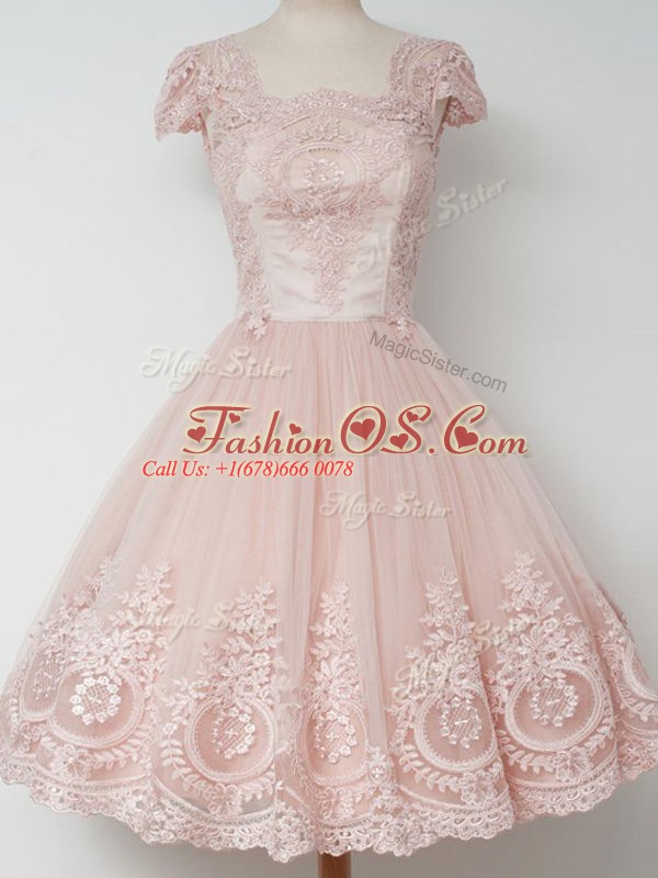Home >  Bridesmaid Dresses >  Hot Sale Bridsmaid Dresses > Deluxe Peach Zipper Square Lace Wedding Party Dress Tulle Cap Sleeves