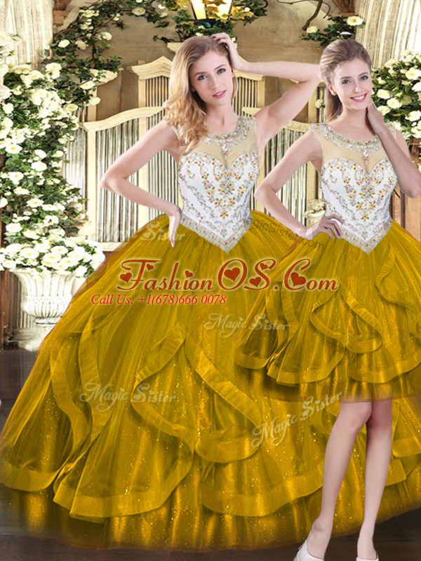 Deluxe Sleeveless Organza Floor Length Zipper Sweet 16 Dresses in Olive Green with Beading and Ruffles
