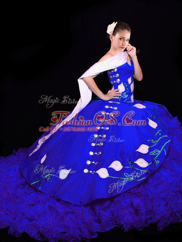 Deluxe Sweetheart Sleeveless Quinceanera Gowns Brush Train Embroidery Royal Blue Organza