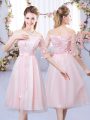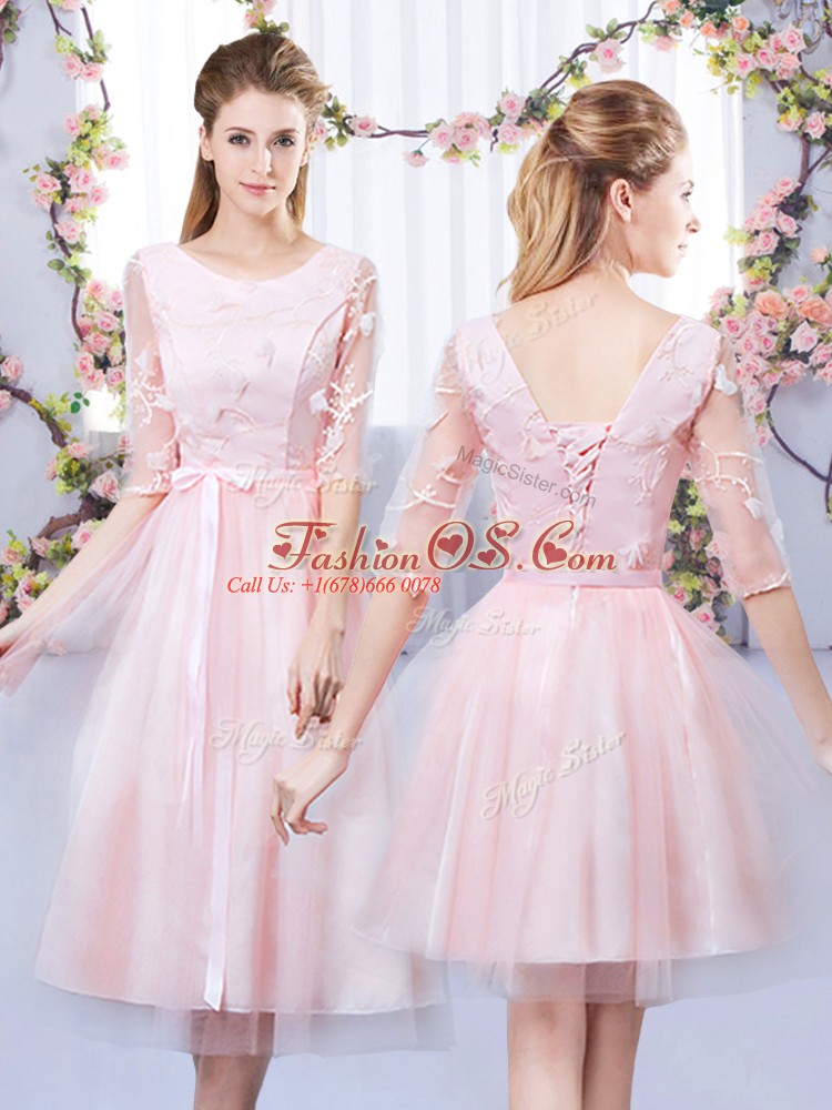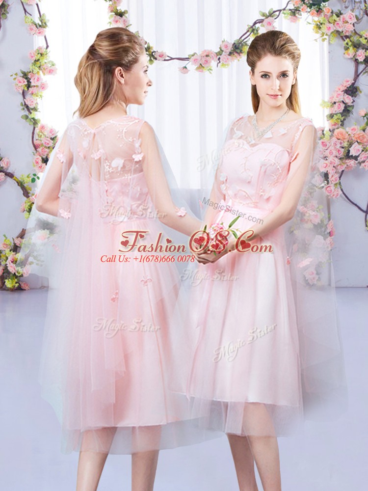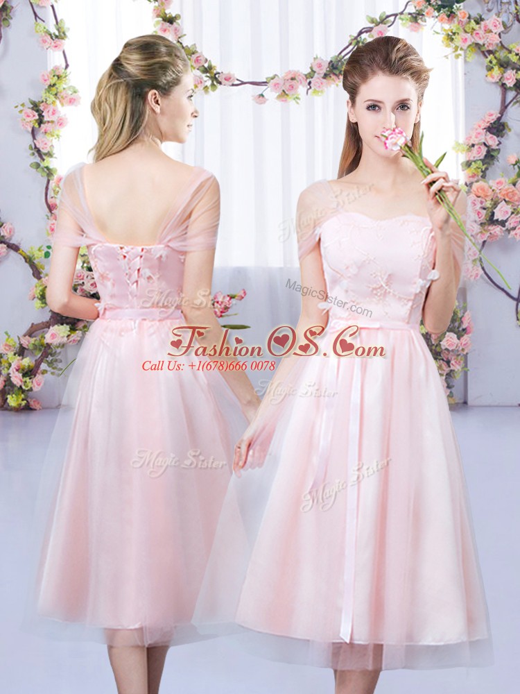 Home >  Special Occasion Dresses >  New Style Dama Dresses > Deluxe Tea Length Empire Sleeveless Baby Pink Quinceanera Court of Honor Dress Lace Up