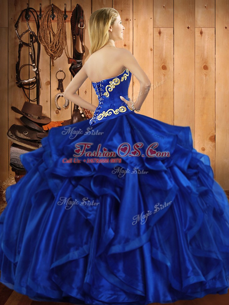 Designer Blue Ball Gowns Sweetheart Sleeveless Organza Floor Length Lace Up Embroidery and Ruffles Vestidos de Quinceanera