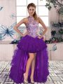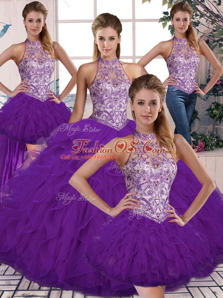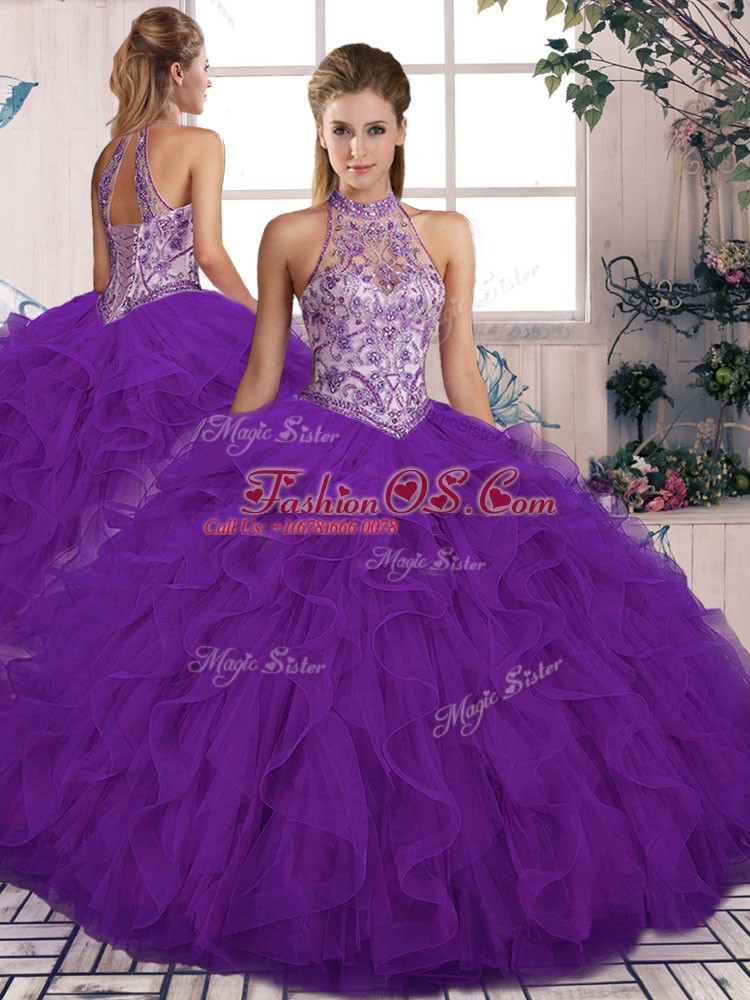 Designer Halter Top Sleeveless Sweet 16 Quinceanera Dress Floor Length Beading and Ruffles Purple Tulle