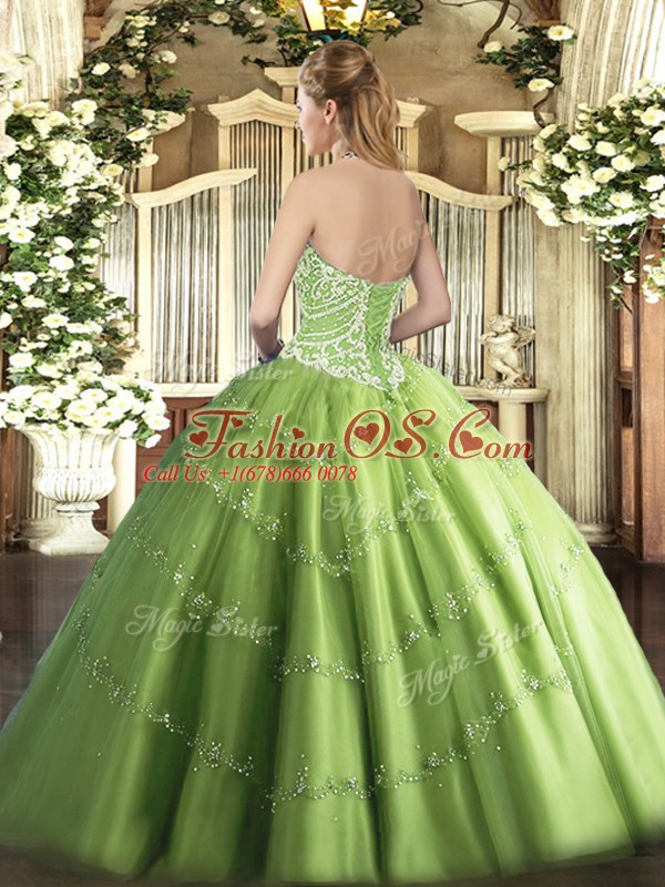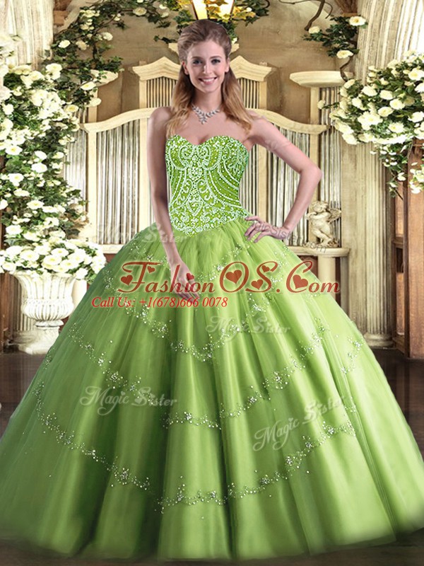 Designer Olive Green Tulle Lace Up Quinceanera Gown Sleeveless Floor Length Beading