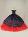 Designer Red And Black Ball Gowns Off The Shoulder Sleeveless Satin and Organza Brush Train Lace Up Embroidery and Ruffles Sweet 16 Dress