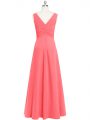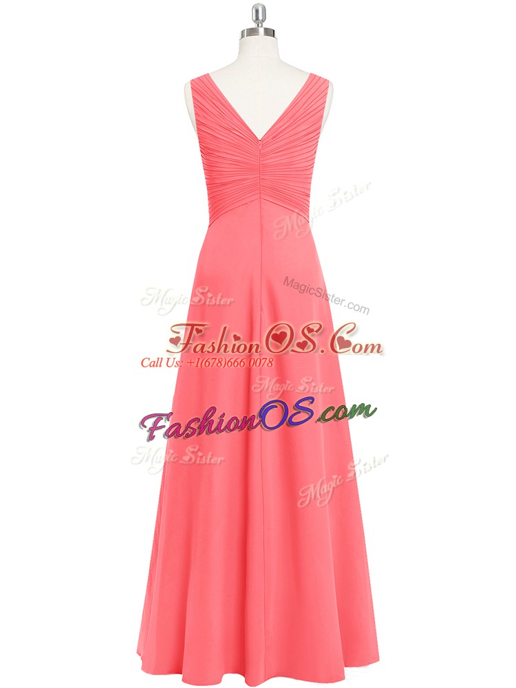 Designer Watermelon Red V-neck Neckline Ruching Dress for Prom Sleeveless Zipper