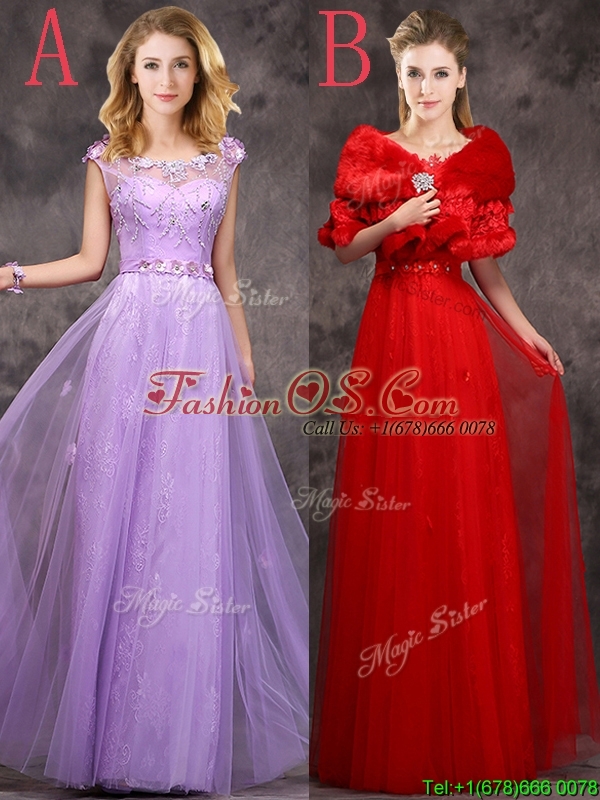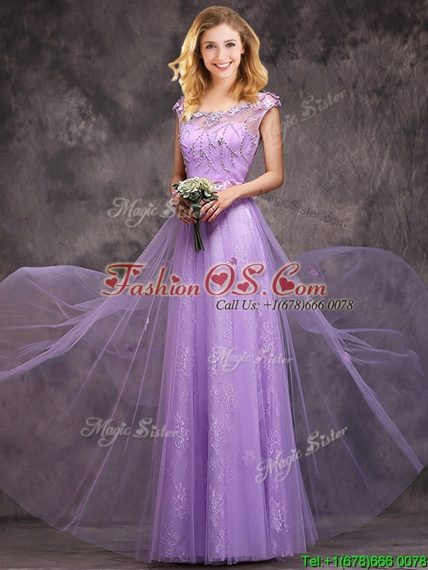 Discount Beaded and Applique Cap Sleeves Long Bridesmaid Dress in Tulle
