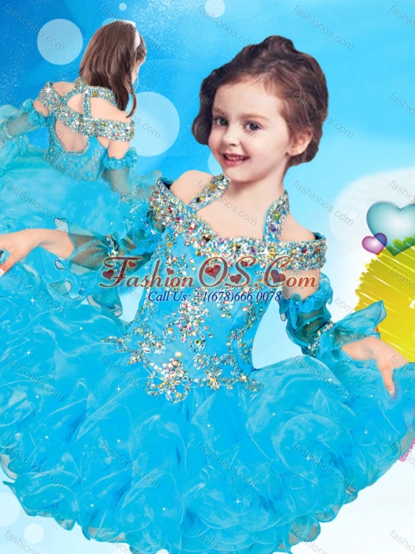 Home >  Special Occasion Dresses >  New Style Little Girl Pageant Dresses > Discount Beaded and Ruffled Cap Sleeves New Style Little Girl Pageant Dress with Halter Top