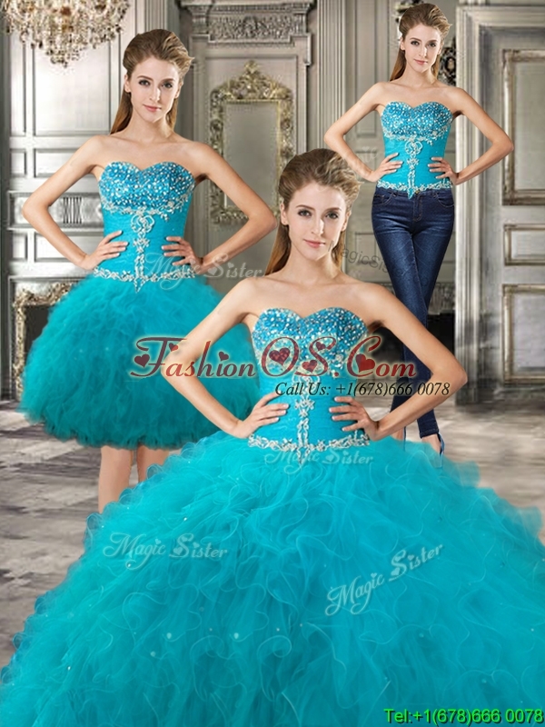 Discount Big Puffy Teal Detachable Quinceanera Dresses with Beading and Ruffles