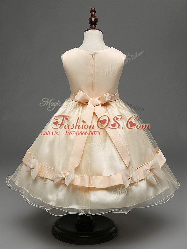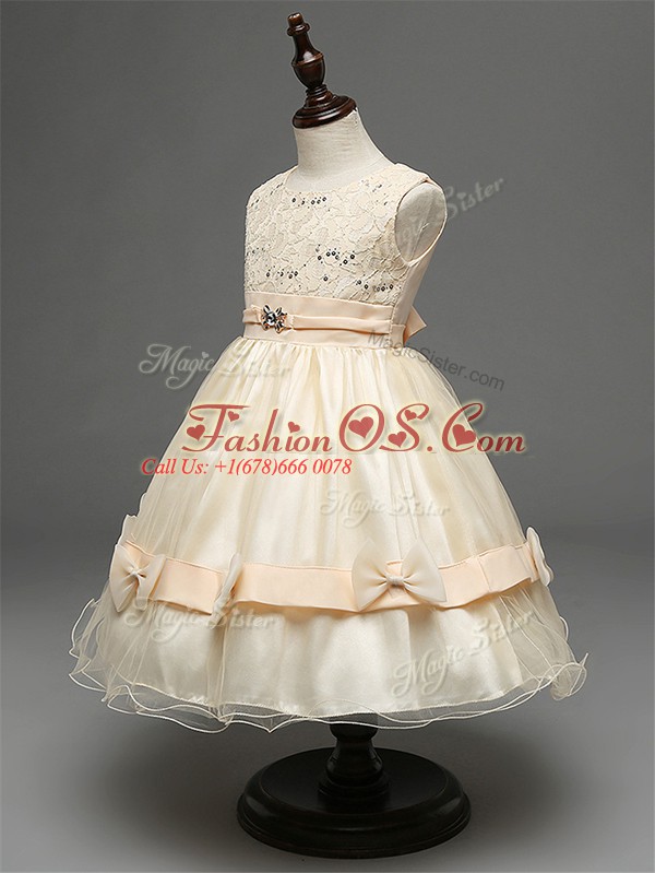 Discount Champagne Ball Gowns Lace and Bowknot Little Girl Pageant Dress Zipper Tulle Sleeveless Knee Length