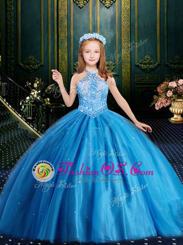 Discount Halter Top Sequins Floor Length Ball Gowns Sleeveless Baby Blue Flower Girl Dress Lace Up